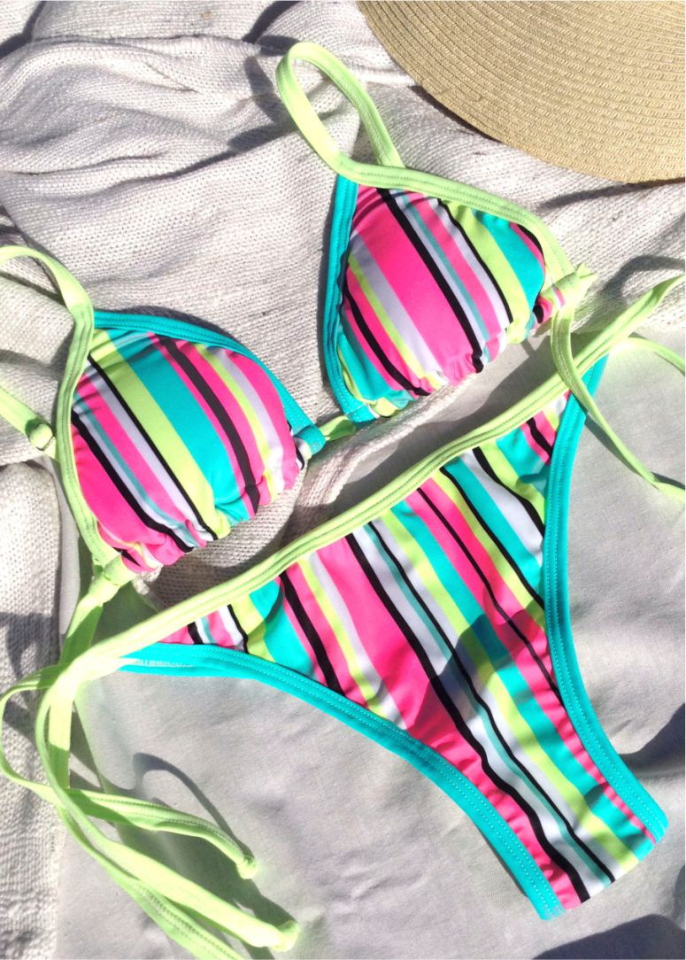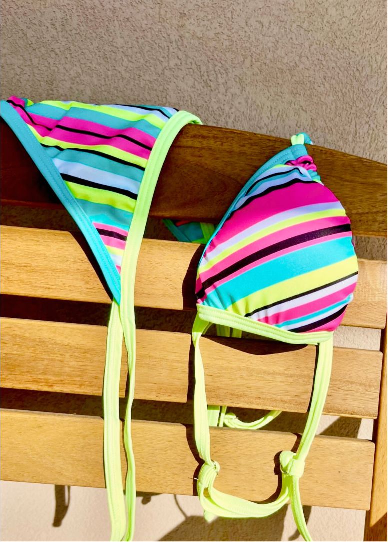 - Top de corte triángulo completamente forrado, con tirantes regulables y para anudar en la espalda, con apertura para almohadillas móviles que están incluidas.